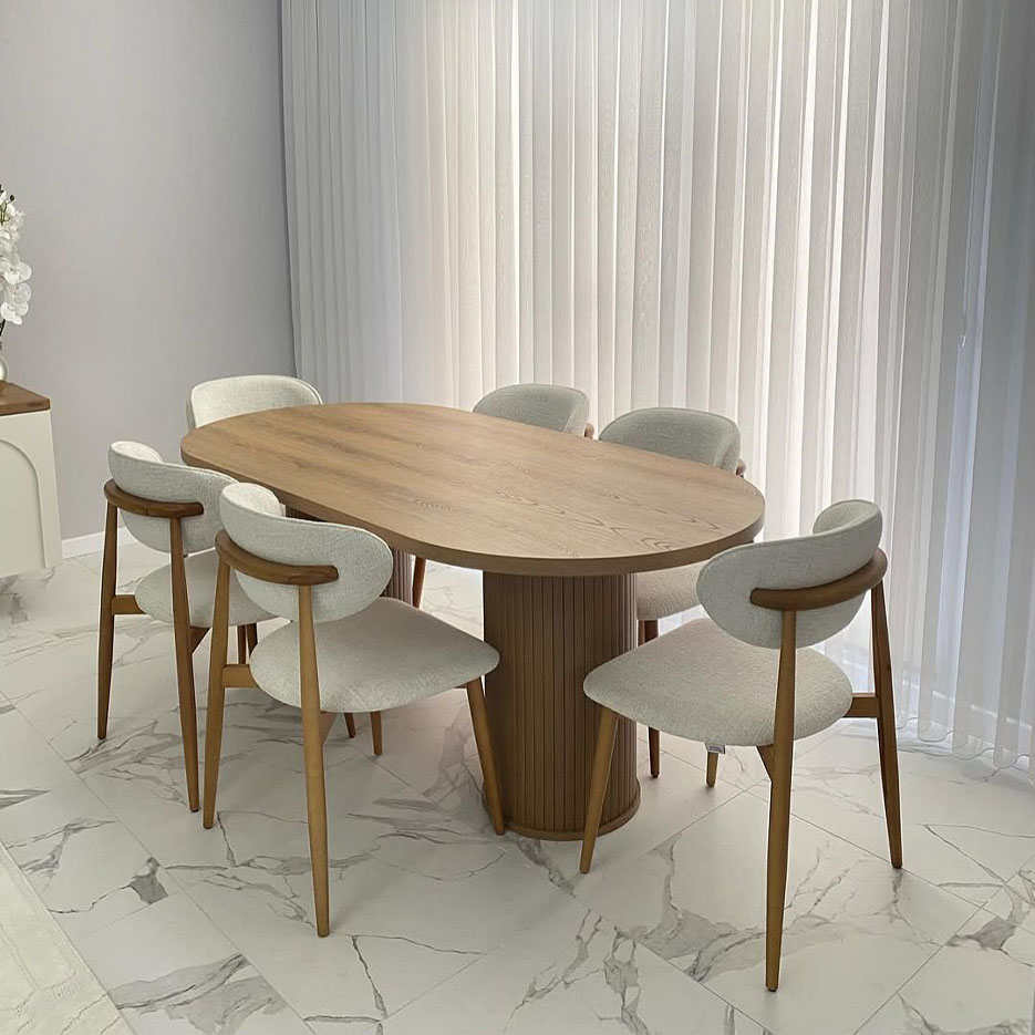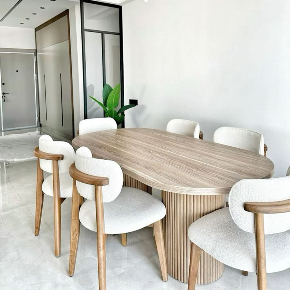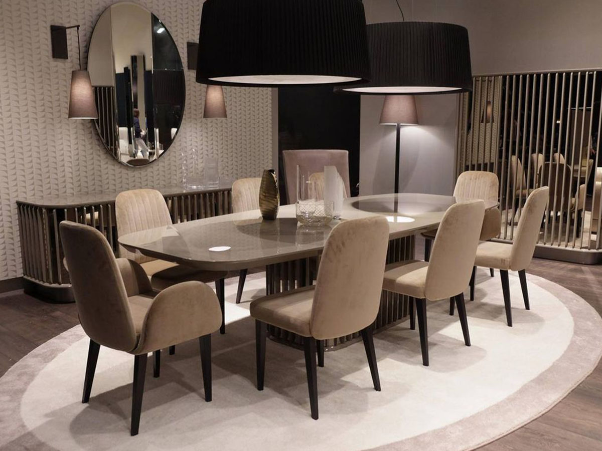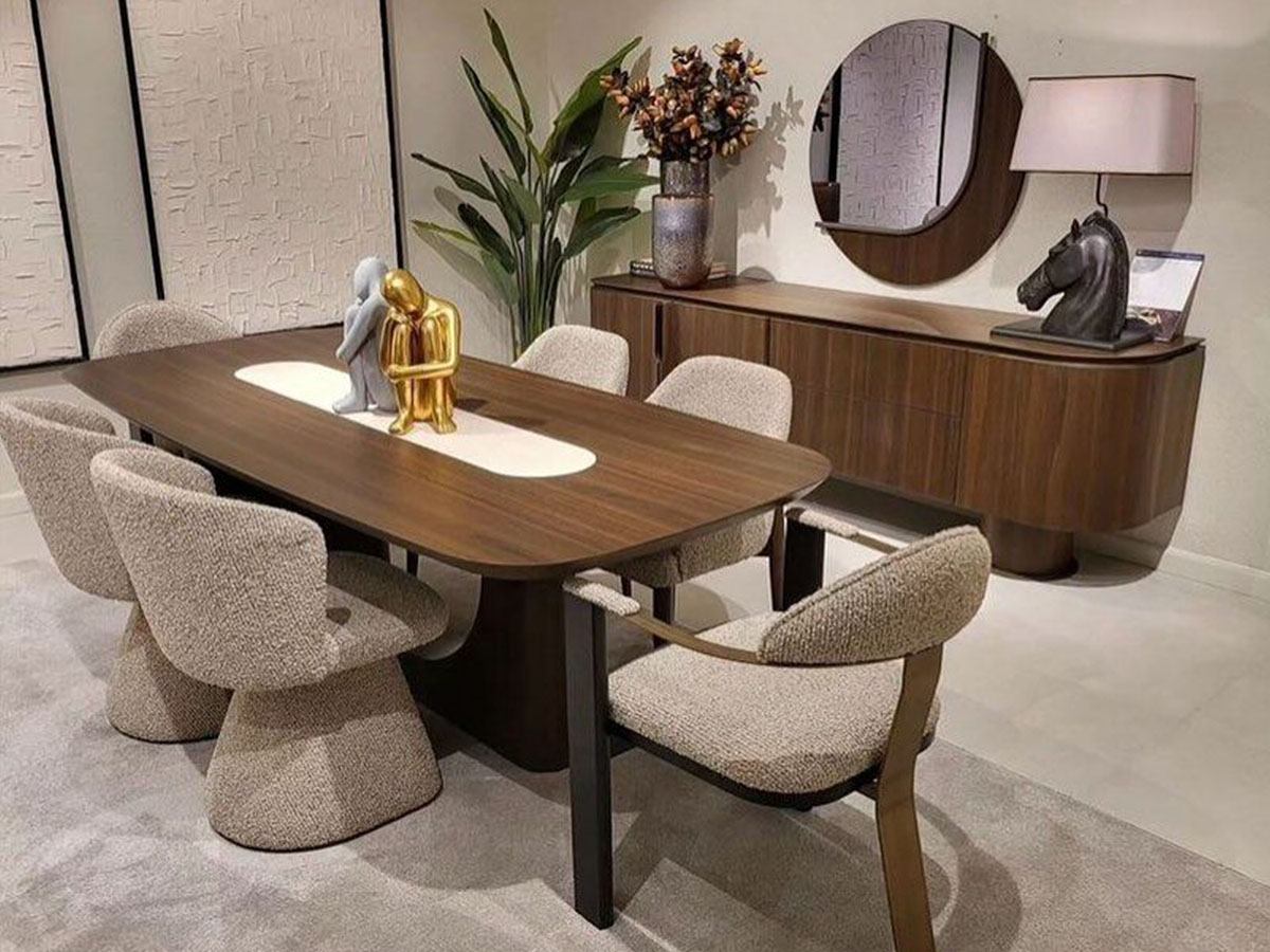 طاولة مودرن بألوان خشبية متناسقة وتفاصيل ناعمة تجمع بين الأصالة والرُقيّ ومساحة تنبض بالفن والهيبة في آن